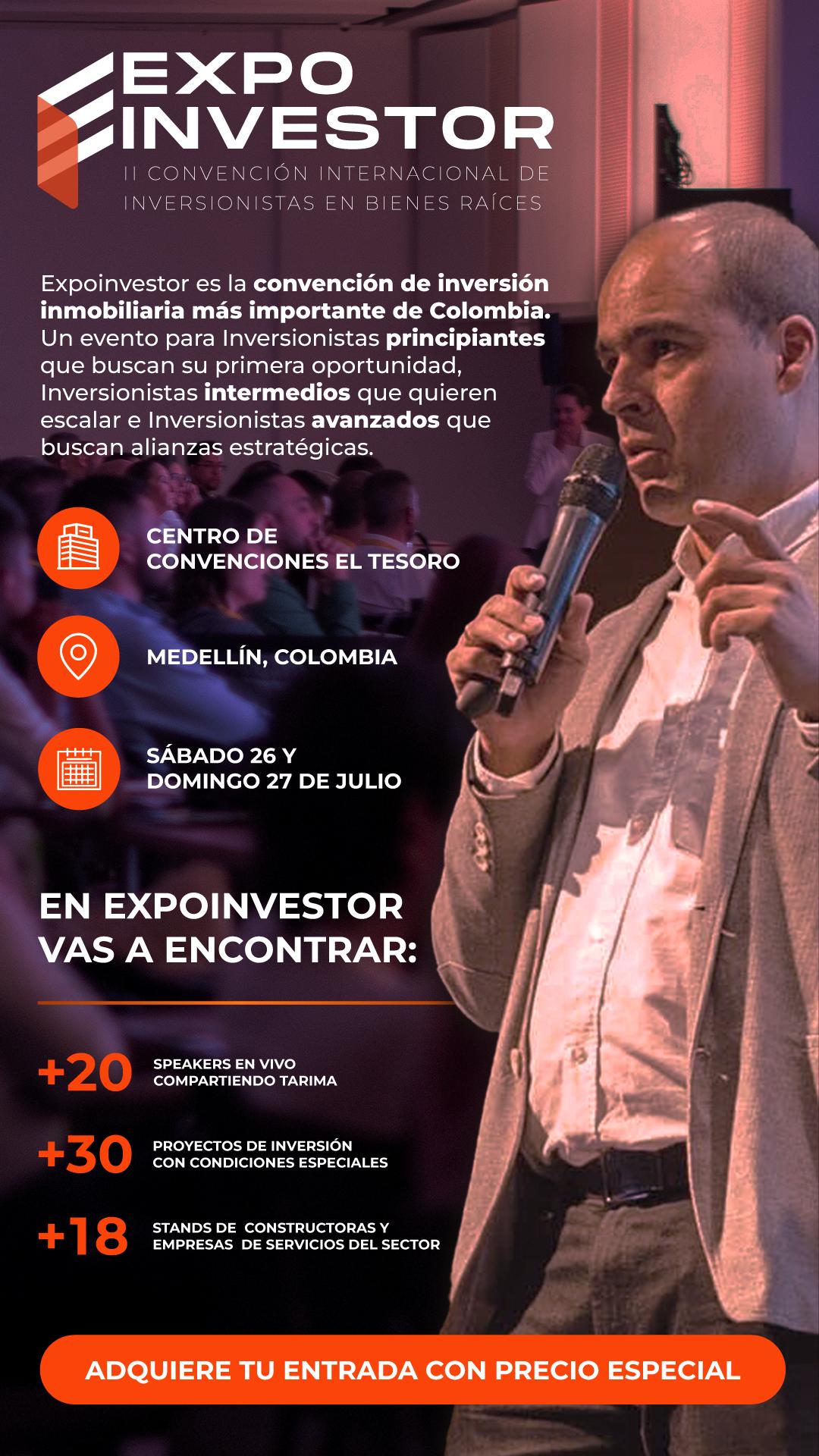 Expo Investor es la convención de inversión inmobiliaria más importante de Colombia, un evento para inversionistas principiantes que buscan su primera oportunidad, inversionistas intermedios que buscan avanzar, e inversionistas avanzados que buscan alianzas estratégicas.